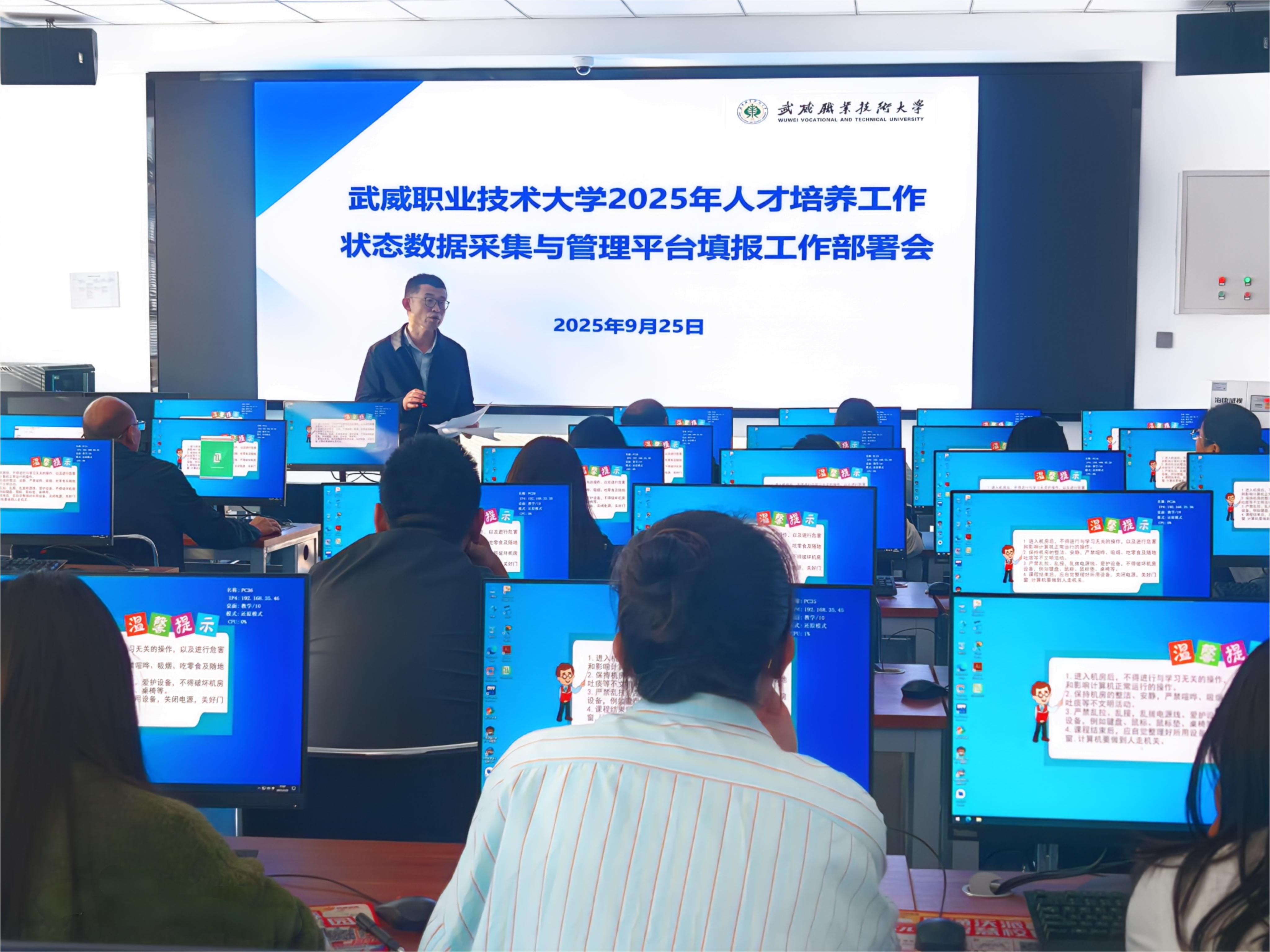 為深入貫徹落實教育部職成司《關于做好職業(yè)教育2024-2025學年數(shù)據(jù)采集工作的通知》精神,根據(jù)《甘肅省教育廳關于開展全省職業(yè)教育2024—2025學年信息數(shù)據(jù)采集工作的通知》要求,確保學校2025年人才培養(yǎng)工作狀態(tài)數(shù)據(jù)采集工作高效、有序開展。9月25日,教務處在篤行樓3樓機房組織召開學校2025年人才培養(yǎng)工作狀態(tài)數(shù)據(jù)采集工作部署會議。教務處、各學院(部)數(shù)據(jù)填報相關工作人員參加會議。