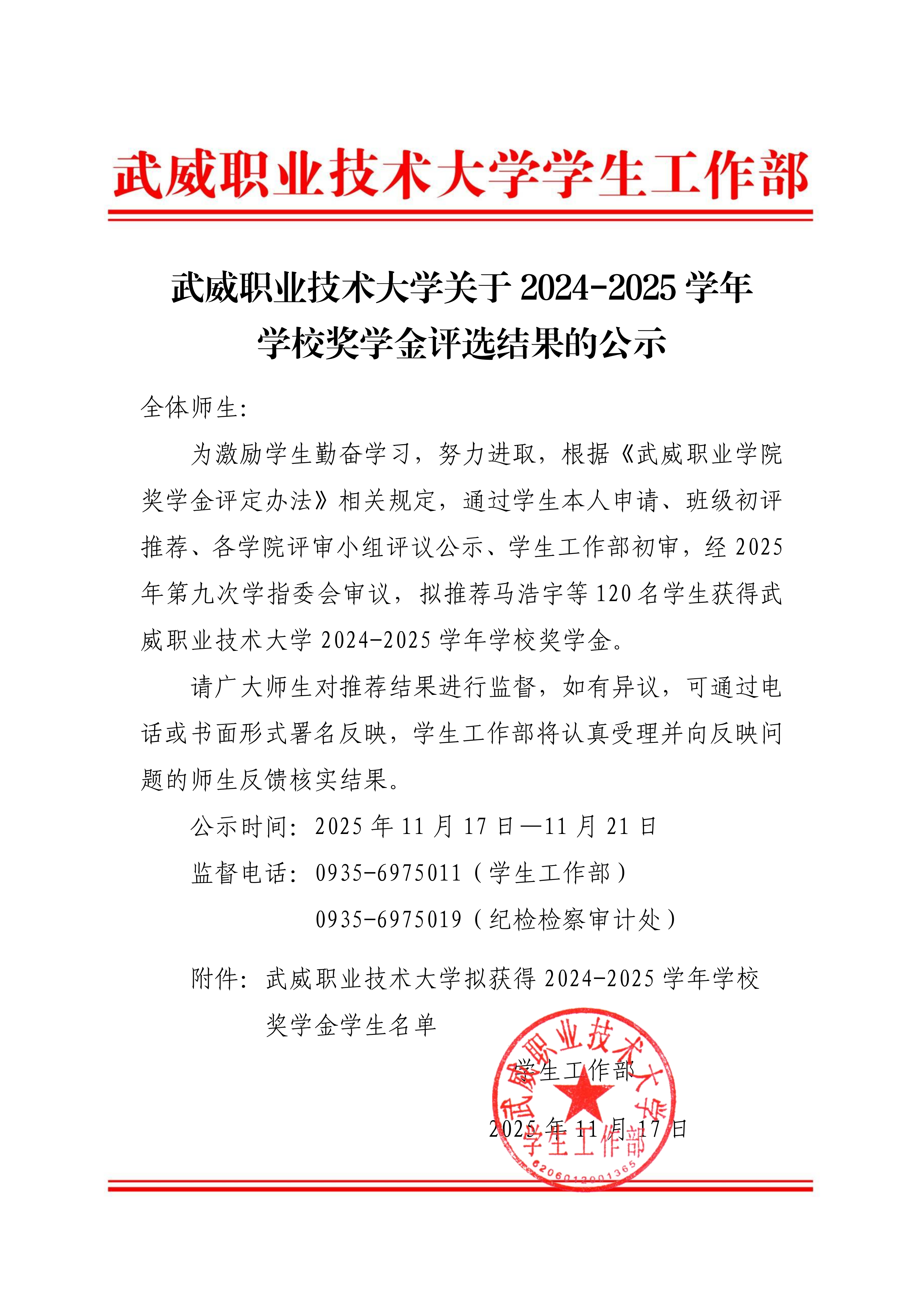 武威職業(yè)技術(shù)大學(xué)關(guān)于2024-2025學(xué)年學(xué)校獎學(xué)金評選結(jié)果的公示