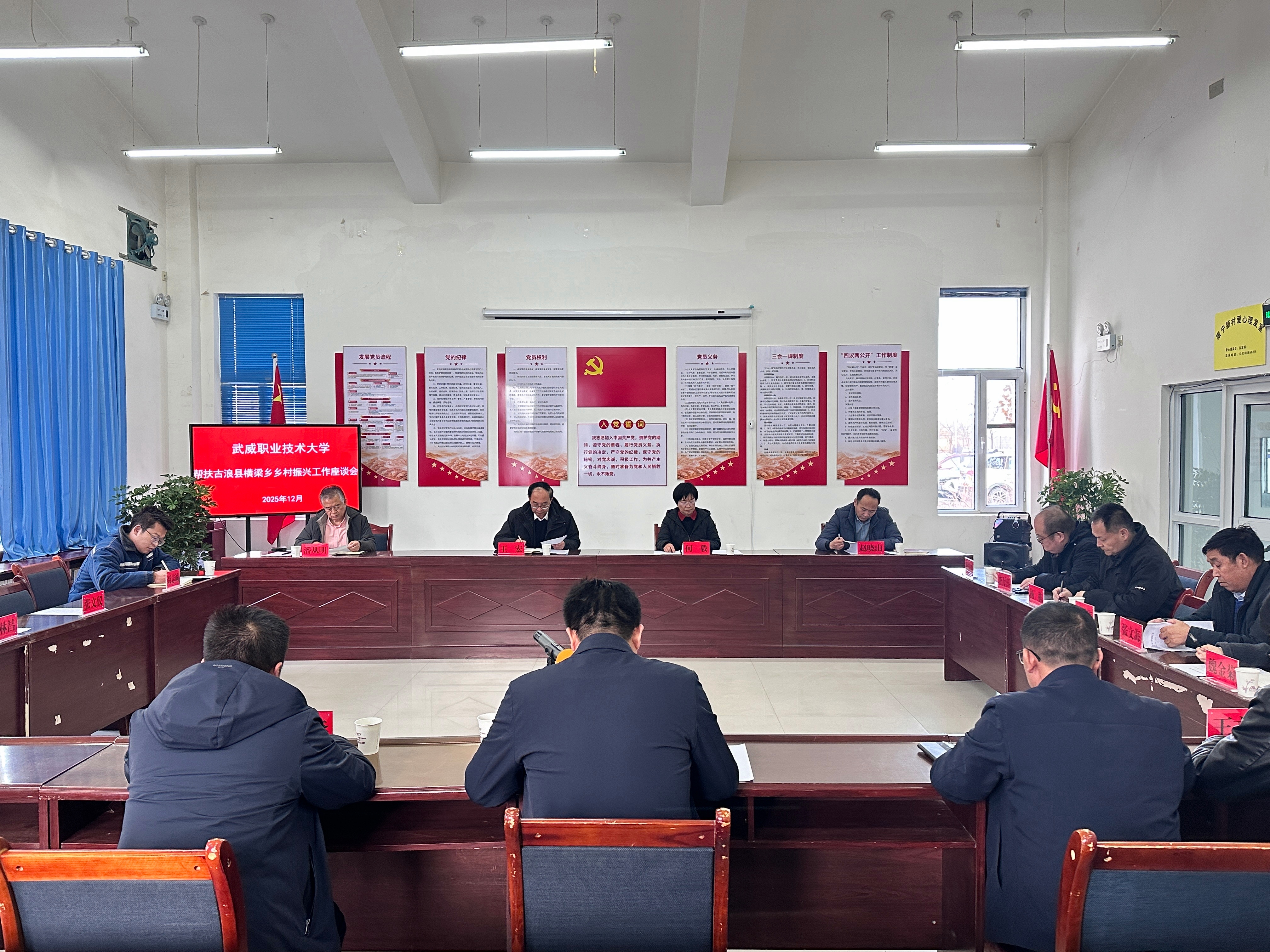 12月9日,黨委書記王宏帶隊到古浪縣橫梁鄉(xiāng)幸福新村、康寧新村,實地調(diào)研鄉(xiāng)村振興幫扶項目進展,并召開校地幫扶工作座談會。黨委委員、副校長何毅,以及校工會、校辦企業(yè)泰豐新能源有限責任公司相關(guān)負責人參加座談會。