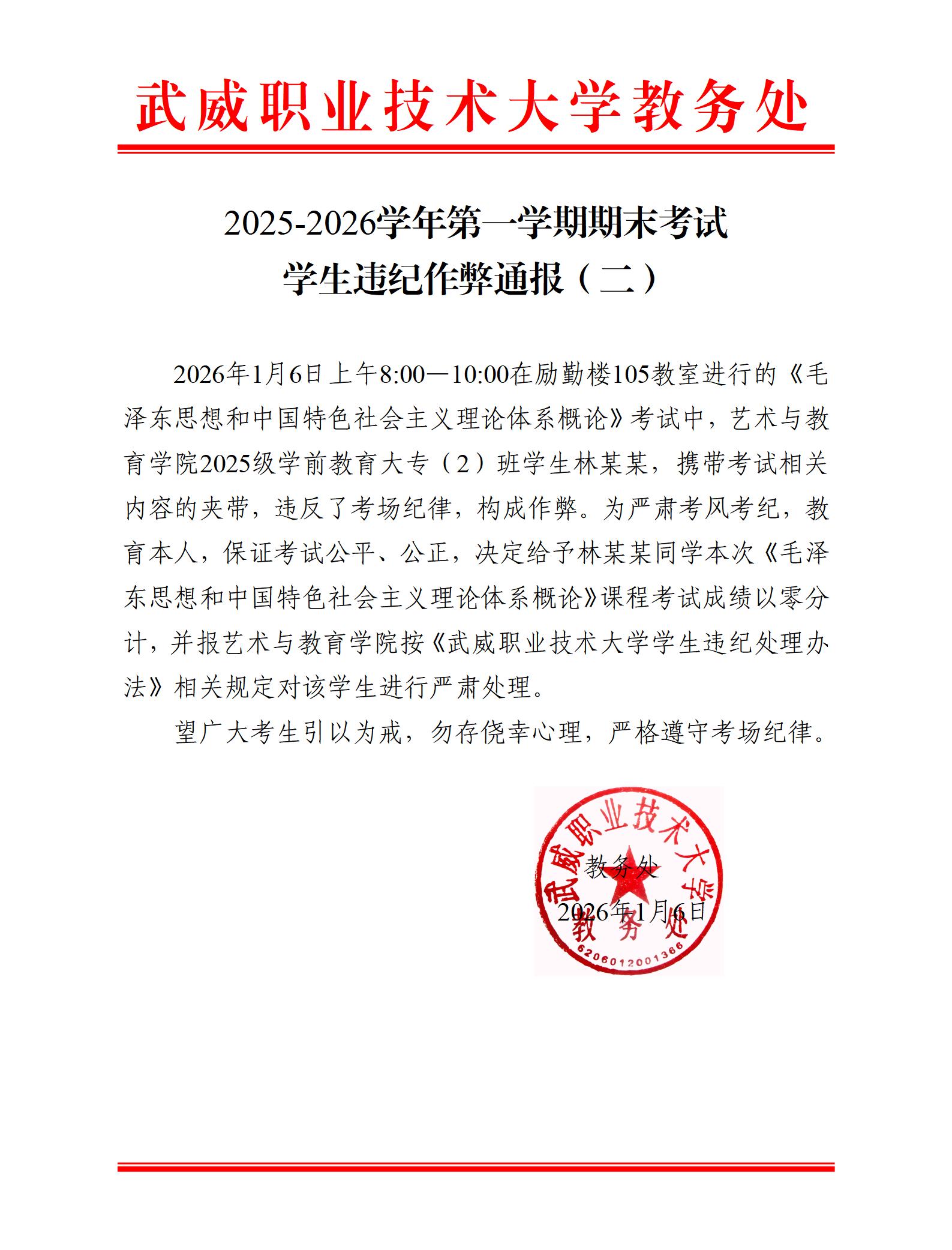 2025-2026學(xué)年第一學(xué)期期末考試學(xué)生違紀(jì)作弊通報(bào)(二)