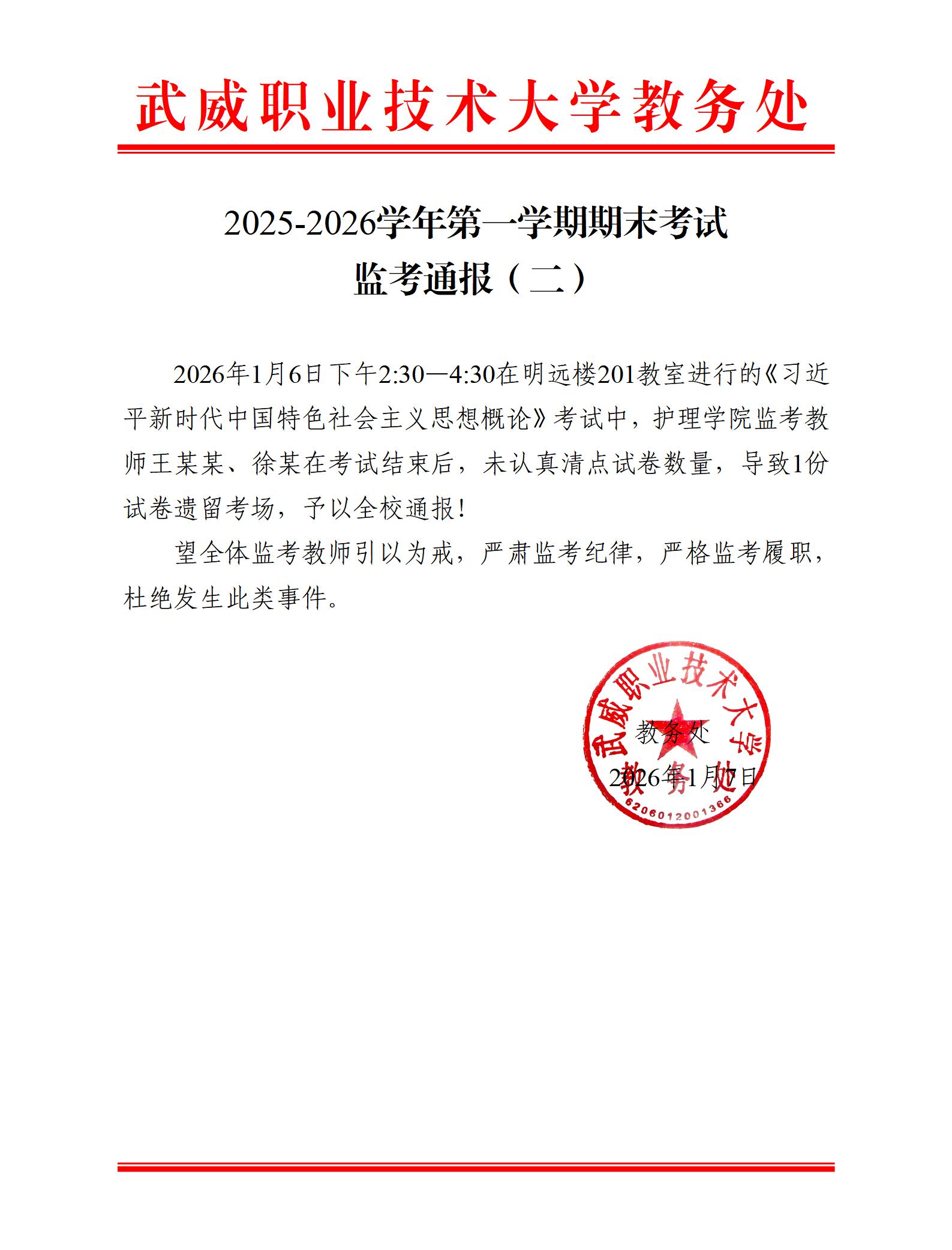 2025-2026學(xué)年第一學(xué)期期末考試監(jiān)考通報(bào)(二)