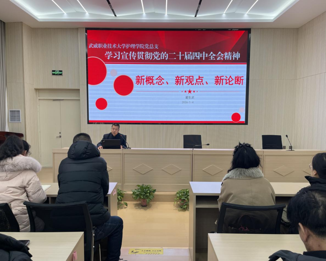 為深入學(xué)習(xí)貫徹黨的二十屆四中全會精神,準確把握國家“十五五”時期發(fā)展藍圖與戰(zhàn)略部署,護理學(xué)院于1月4日下午在圖書館報告廳召開專題宣講會。學(xué)院黨總支書記藺生武作宣講報告,全體教職工、入黨積極分子及學(xué)生代表等80余人參加。